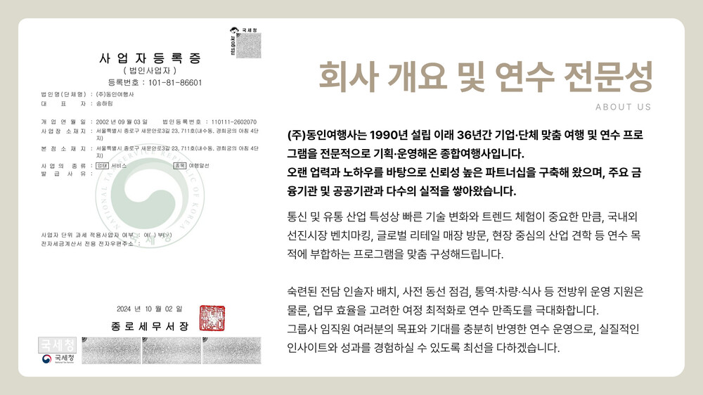 동인 여행사는 기업 고객 대상 단체여행에 특화된 여행사로,